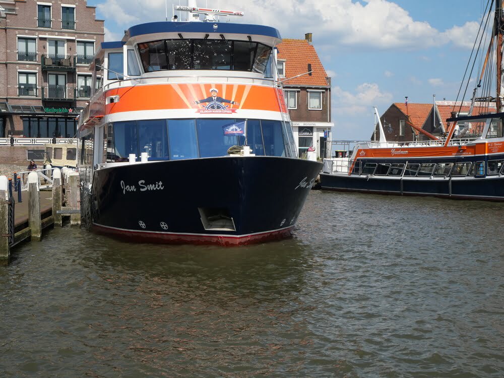Welkom aan boord van de rondvaartboot. Jullie varen vanuit de haven van Marken naar de haven van Volendam. Geniet van het uitzicht op zee, havens en andere schepen. De haven van Marken verdwijnt langzaam uit het zicht, terwijl de haven van Volendam steeds duidelijker in zicht komt.